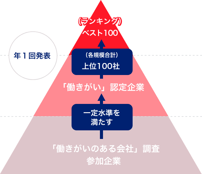 「働きがいのある会社」調査を実施し、働きがいに関する調査の結果が一定水準を超えた企業を「働きがい認定企業」、さらにその上位企業を「働きがいのある会社」ランキングとして発表しています。